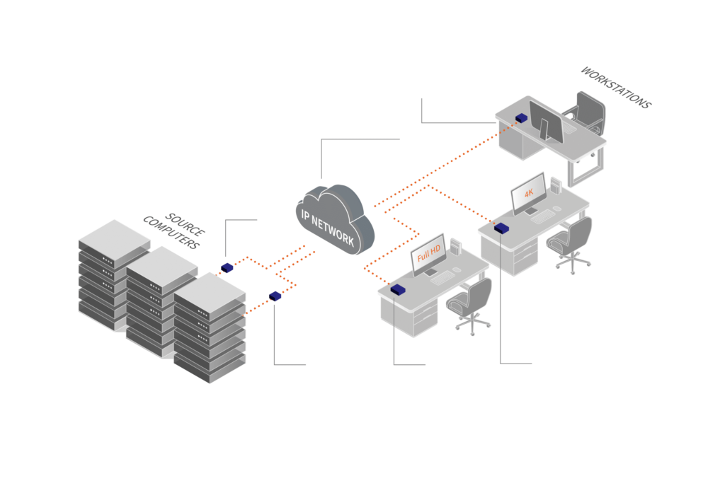 Au lieu d’être commutés au travers d’une matrice propriétaire qui contient la configuration comme pour IHSE, les déports sur IP KVM-TEC sont commutés au travers de switchs sur IP.