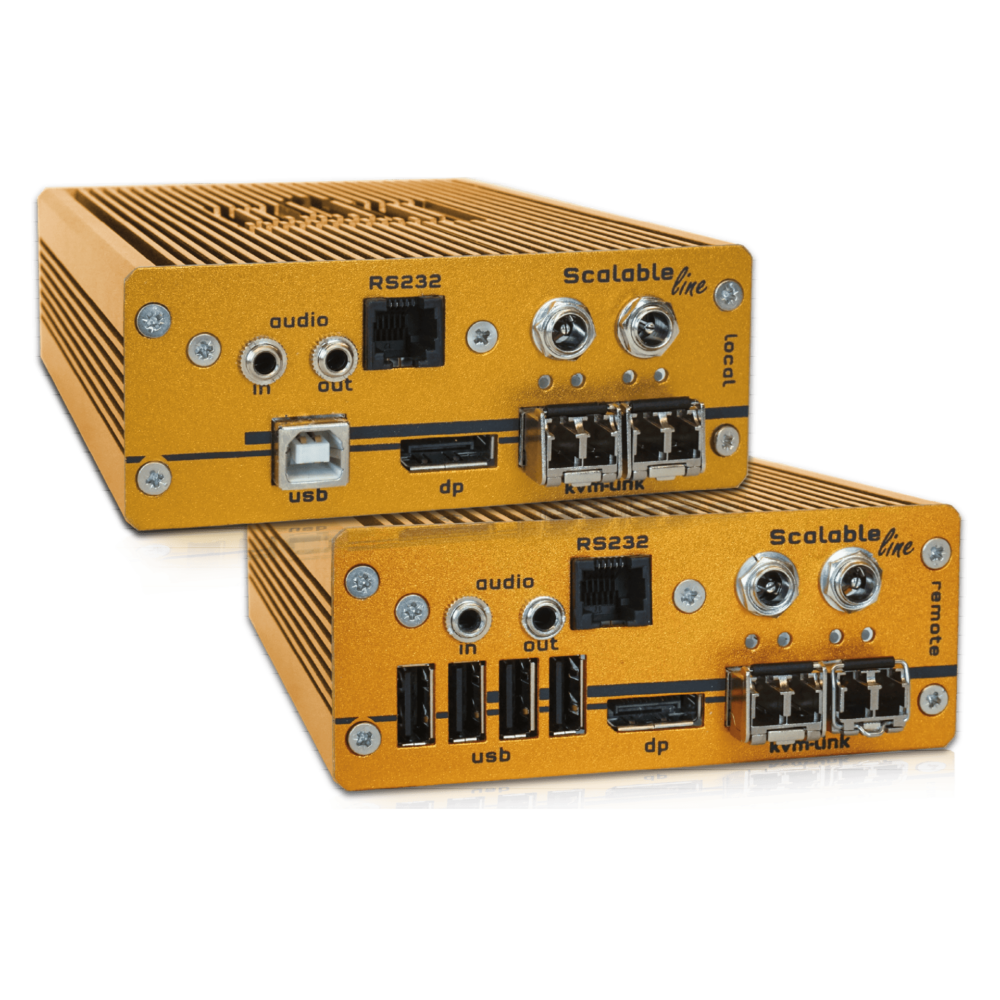 Les écrans extra larges avec des résolutions de 5Kx1.4K/2K sont également supportés. D’autres périphériques, tels USB, RS232 et audio peuvent être connectés. Ces déports peuvent être utilisés en mode point à point ou bien au travers d’un réseau IP dans le cadre d’un système KVM en utilisant un switching manager.